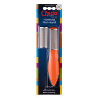 The CREDO PopArt callus flat orange in pink is a safe alternative to removing calluses. Many micro pyramids rasp off unnecessary calluses. Depending on the hardening, you can choose between the replaceable coarse or fine rasping surface. The Credo callus flat rasp can be used both back and forth, as well as circularly. Rubbed calluses are largely collected in the container under the rasp surface and can be easily disposed of under running water. Simply remove the clip from the holder and dry on a towel after cleaning. Made of stainless steel with colourful PopArt ABS plastic handles. Suitable for nickel allergy sufferers. Diabetics and bleeders should consult your doctor before use. Packaged in blister pack. Made in Solingen, Germany.
