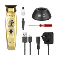 StyleCraft by Silver Bullet Saber Hair Trimmer is the supreme professional trimmer with heavy duty all-metal body, skeleton design and 360 exposed blade. Equipped with a high torque, long-life, low vibration, digital brushless motor running at 7,500 rpm. Black Diamond The One deep tooth cutting blade for efficient smoothness and Gold Titanium X-Pro wide fixed blade for sharpest lines. Fully adjustable blade can be zero gapped for the closest cut and finish. Skeleton design exposes blade for 360 visibility. Lithium ion battery with four hours of cordless runtime (recharges in only 90 minutes). Universal USB, charging base or cord recharging.
