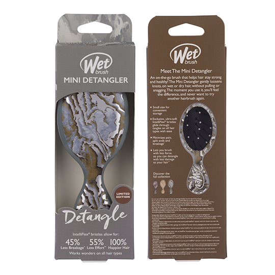 Meet the WetBrush Engineered Nature Mini Detangler Grey. The on-the-go brush which helps hair stay strong! Wet Brush Mini Detangler gently loosens knots on wet or dry hair without pulling or snagging. The moment you use it, youll feel the difference and never want to try another detangling brush again. Exclusive, ultra-soft IntelliFlex bristles glide through tangles on all hair types with ease. Minimise pain and protect against split ends and breakage. Small size for convenient storage and travel. Gorgeous, limited edition, abstract design.