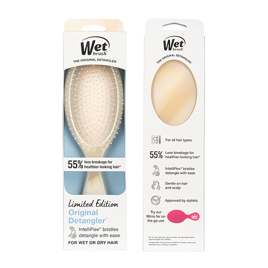 The WetBrush Iridescence Detangler in Cream features a soft, luminous, iridescent finish. This is the world famous, award-winning Original Detangler redesigned by stylists for stylists. Revolutionary IntelliFlex bristles diffuse knots on all hair types, wet or dry, gliding through tangles with less effort, less pain and over 55%* less breakage.