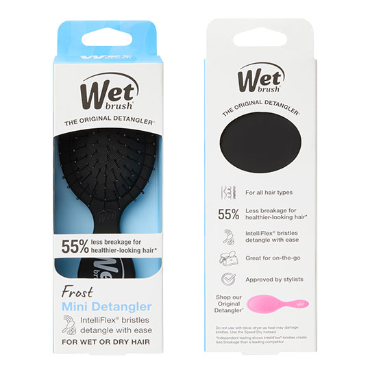 Boldly detangle with this adorable on-the-go brush! WetBrush Frost Mini Detangler in Black helps hair stay strong and healthy-looking. Gently loosen knots on wet or dry hair, without pulling or snagging. Exclusive, ultra-soft IntelliFlex bristles glide through tangles on all hair types with ease. The moment you use it, youll feel the difference and never want to try another hairbrush again. Kids love it too!
