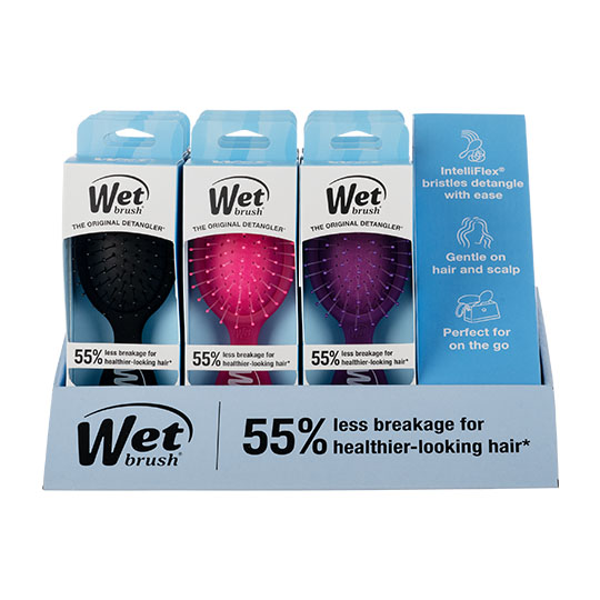 A stylish display featuring the WetBrush Frost collection. Revolutionary IntelliFlex bristles diffuse knots on all hair types, wet or dry, gliding through tangles with less effort, less pain and over 55% less breakage for healthier-looking hair*.
