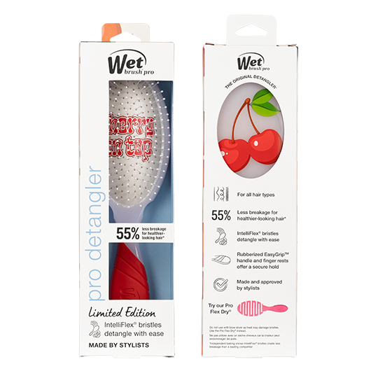The vibrant spirit of summer! WetBrush Pro Tutti Fruitti Detangler Cherry features a limited edition fruit design. This is the world famous, award-winning Original Detangler redesigned by stylists for stylists. Revolutionary IntelliFlex bristles diffuse knots on all hair types, wet or dry, gliding through tangles with less effort, less pain and over 55%* less breakage. Ergonomically advanced with finger rests and rubberised EasyGrip handle for more comfort and control.