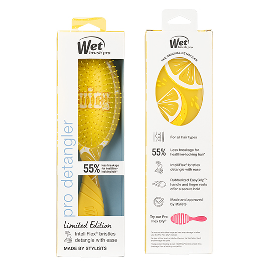 The vibrant spirit of summer! WetBrush Pro Tutti Fruitti Detangler Lemon features a limited edition fruit design. This is the world famous, award-winning Original Detangler redesigned by stylists for stylists. Revolutionary IntelliFlex bristles diffuse knots on all hair types, wet or dry, gliding through tangles with less effort, less pain and over 55%* less breakage. Ergonomically advanced with finger rests and rubberised EasyGrip handle for more comfort and control.