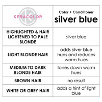 Keracolor Color + Keracolor Color Clenditioner Colour Shampoo in Silver Blue cleanses, nourishes and imparts gorgeous colour onto your hair! This non-lathering conditioning cleanser instantly deposits direct dye colour pigments with every wash. Perfect to maintain vibrant coloured hair and prevent fading, or mix it up between salon visits. Colours becoming more vibrant and longer lasting with every wash. Pigment can last up to 10-15 washes, depending on porosity and pre-lightened level!