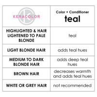 Keracolor Color Clenditioner Colour Shampoo in Teal cleanses, nourishes and imparts gorgeous colour onto your hair! This non-lathering conditioning cleanser instantly deposits direct dye colour pigments with every wash. Perfect to maintain vibrant coloured hair and prevent fading, or mix it up between salon visits. Colours becoming more vibrant and longer lasting with every wash. Pigment can last up to 10-15 washes, depending on porosity and pre-lightened level!